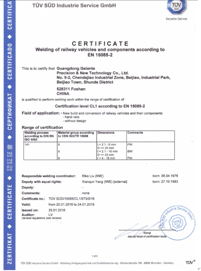 2014年11月,格藍特公司開展IRIS 認證體系的工作以及相關培訓。 2016年1月29日,南德認..